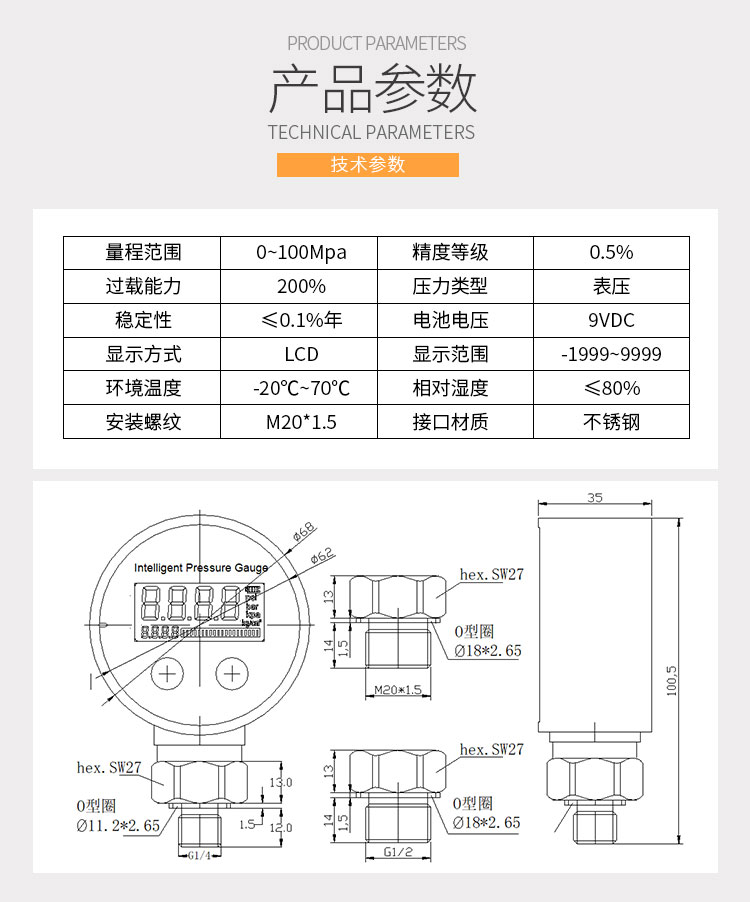 數(shù)字壓力表為全電子結(jié)構(gòu),采用電池供電,現(xiàn)場安裝簡易。前端采用高精度壓阻式壓力傳感器,輸出信號由高精度,低溫漂的放大器放大處理,送入高精度的A/D轉(zhuǎn)換器,轉(zhuǎn)換成微處理器可以處理的數(shù)字信號,經(jīng)過運算處理,由LCD顯示器顯示出實際的壓力值。 該智能數(shù)顯壓力表使用靈活,操作簡單,調(diào)試容易,安全可靠。