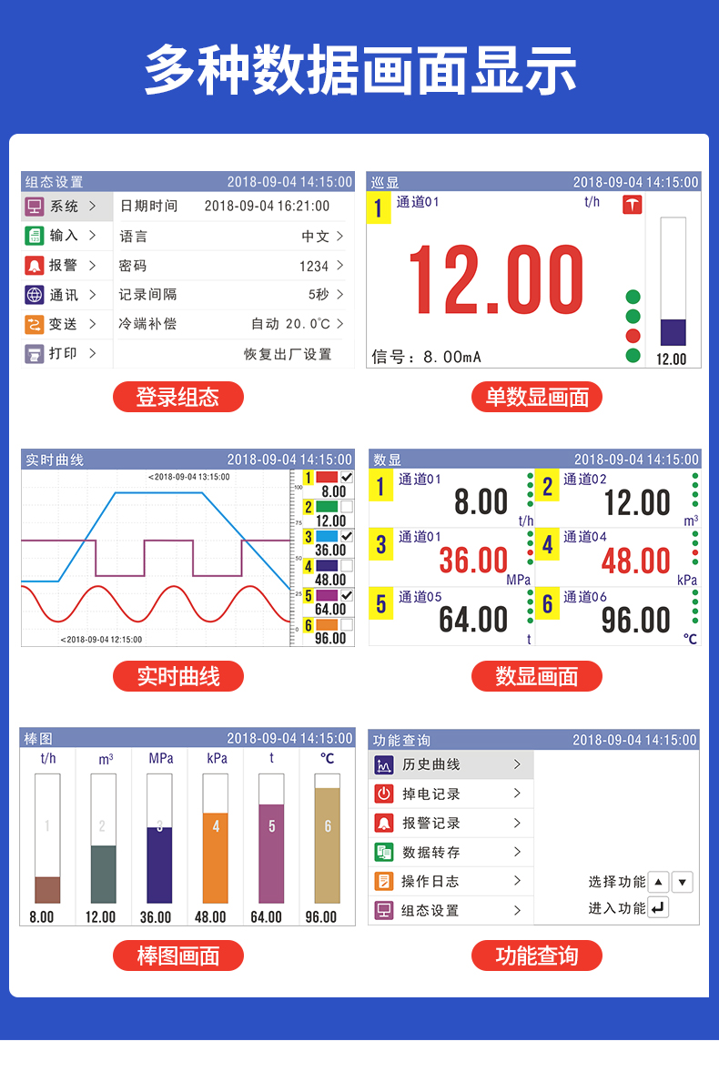 本產(chǎn)品是將工業(yè)現(xiàn)場的需要監(jiān)視記錄的輸入信號通過高性能微處理器進(jìn)行數(shù)據(jù)處理并轉(zhuǎn)換為可識別和讀取信號的儀器,一方面在高分辨率液晶顯示屏上以多種形式的畫面顯示出來,另一方面把監(jiān)察信號數(shù)據(jù)存放在儀表內(nèi)部的大容量存儲芯片中并可在儀表上直接進(jìn)行數(shù)據(jù)和圖形查詢、翻閱和打印。